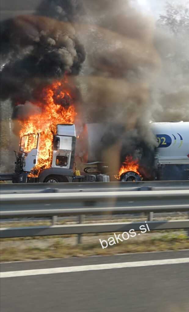 Trčenje cisterne in še enega tovornjaka, kjer je tudi zagorelo, je povzročilo veliko materialno škodo