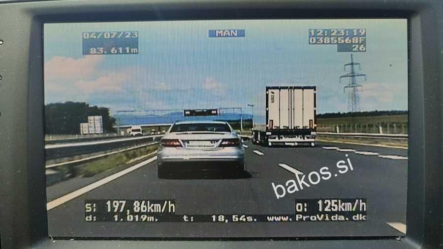 Policisti PPP Maribor so danes opravljali nadzor prometa z vozilom z vgrajenim videonadzornim sistemom Provida 2000 na podravski avtocesti A4 na relaciji Zlatoličje – Slivnica, na odseku, kjer je omejitev hitrosti 130 km/h. Okrog 12.20 so ugotovili, da je voznik osebnega avtomobila, 46-letni voznik iz okolice Ptuja, izven naselja Prepolje vozil s povprečno hitrostjo 197 km/h. Med postopkom je bil vozniku odrejen preizkus z indikatorjem alkohola, ki je pokazal rezultat 0.32 miligrama alkohola v litru izdihanega zraka. Policisti so vozniku prepovedali nadaljnjo vožnjo ter mu začasno odvzeli vozniško dovoljenje. Vozniku je bil na kraju izdan plačilni nalog.