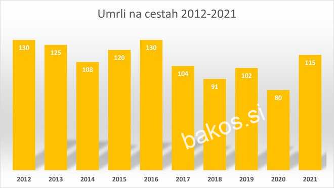 Avto-moto zveza Slovenije (AMZS) je pripravila analizo prometne varnosti za minulo leto. Število umrlih na slovenskih cestah v prejšnjem letu je sicer precej višje kot zadnjih pet let, a v tem trenutku bi bilo preuranjeno sklepati, da gre za začetek izrazitega poslabševanja prometne varnosti. Pri tem so poudarili, da leta 2021 ni mogoče primerjati z 2020, ki se je sicer v zgodovino zapisalo kot leto, ko je na slovenskih cestah za posledicami prometnih nesreč umrlo najmanj ljudi, odkar se beležijo tovrstni podatki (80). Toda evforije ob tem ne bi smelo biti, saj bi morala biti številka umrlih in hudo poškodovanih zaradi manj prometa na cestah, na kar je vplivala epidemija covida 19, še manjša. AMZS analiza prometne varnosti za 2021 zato temelji na daljšem časovnem obdobju.