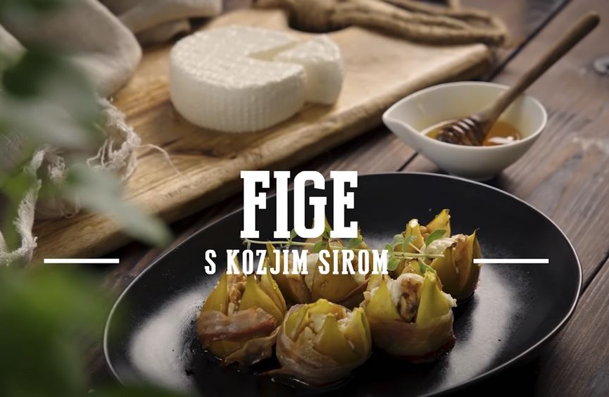 Sestavine: 9 slovenskih fig, 2 žličku slovenskega medu, 125 g kozjega sira znakom »izbrana kakovost – Slovenija«, 1 pest zdrobljenih orehov, 9 rezin slanine