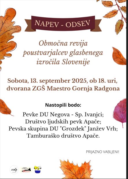 To soboto, ob 18. uri, se v dvorani ZGŠ Maestro (pri cerkvi) v Gornji Radgoni obeta še en čudovit glasbeni dogodek. V organizaciji JSKD OI Gornja Radgona bo namreč na sporedu Območna revija poustvarjalcev glasbenega izročila Slovenije “Napev-odsev 2025”. Nastopile bodo štiri skupine in za vse, ki imajo radi lepe slovenske pesmi, je to velika priložnost