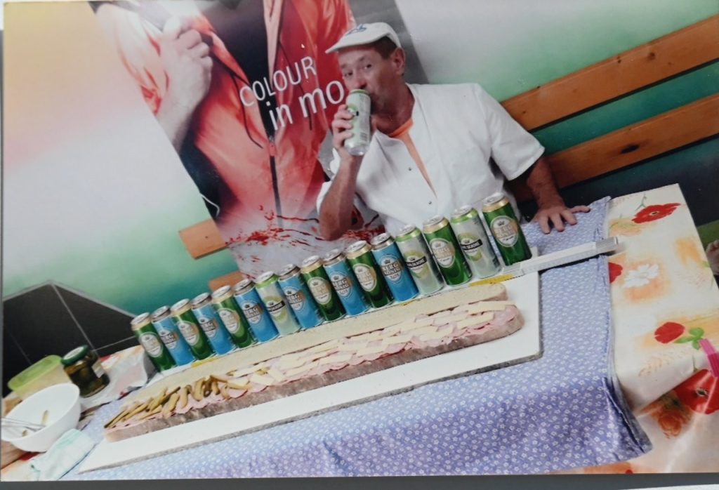 Branko sedaj peče kruh, ko si zaželi domačega kruha. Ob »odprtju pekarne«, je pristopil k peki posebno velikega kruha. Spekel je štruco, ki je bila dolga natančno en meter. Kot je dejal, je za to porabil 12 kg moke tipa 800, dodal pa je le malo ržene moke. V peč jo je spravil s posebno desko, da je s tem obdržala njeno obliko. Kot pravi mu je peka uspela, kar je potrdilo, da peč opravlja svojo funkcijo. Kruh, ki ga je spekel, je po dolžini prerezal in ga spremenil v metrski sendvič. Nanj je naložil kake 3 kg salam in nekaj narezanih kislih kumaric. Na sendvič je povabil sosede in prijatelje, ki so ob dobri kapljici hvalili njegov izdelek. (L.K.)