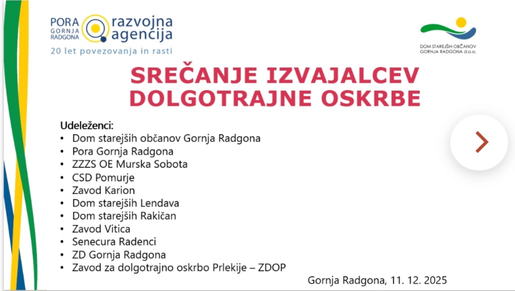 Razprava je bila zelo konstruktivna in naravnana na aktualne težave. Udeleženci so prejeli številne informacije o tem, kako bo potekalo izmenjava podatkov z ZZZS in z vstopno točko CSD Ljubljana. Zaključili so z dogovorom, da se naslednji srečajo v SeneCuri Radenci, v mesecu februarju 2026. Do takrat si vsi želijo, da bo izvajanje storitev potekalo nemoteno in da stanovalci ne bodo čutili prehoda v nov sistem dolgotrajne oskrbe. (S.B.A.)