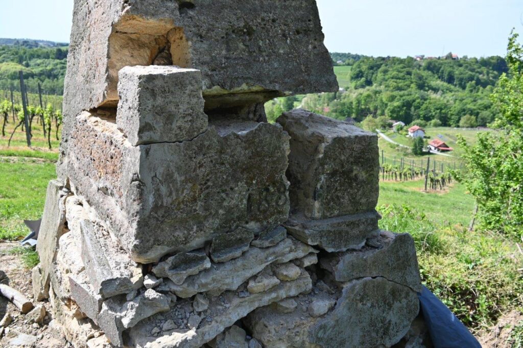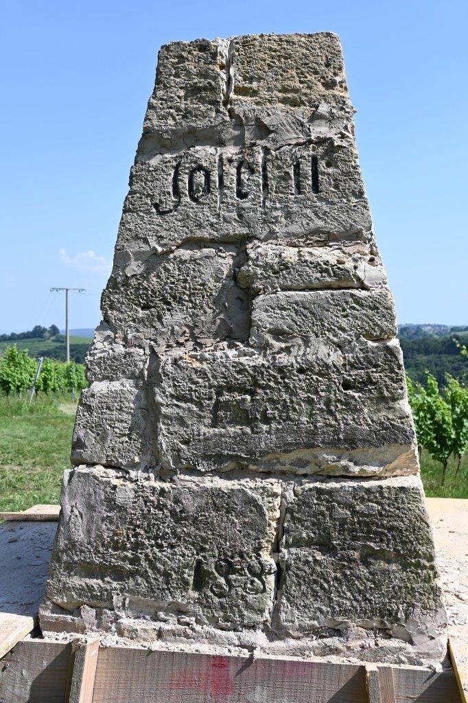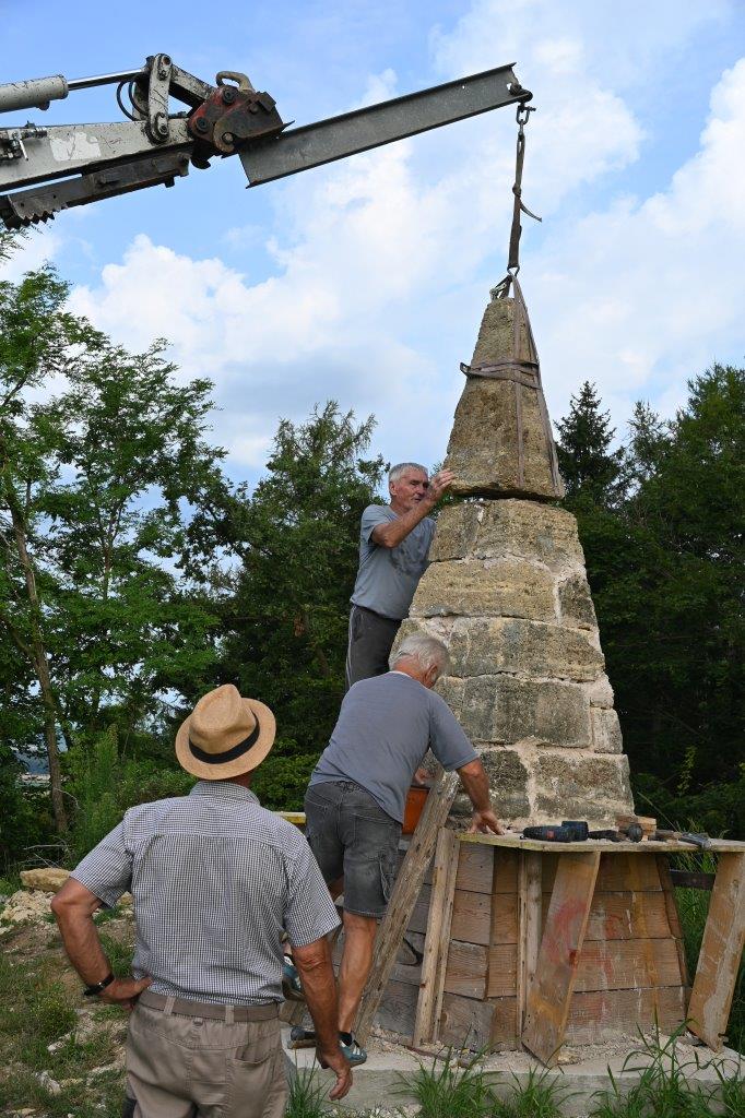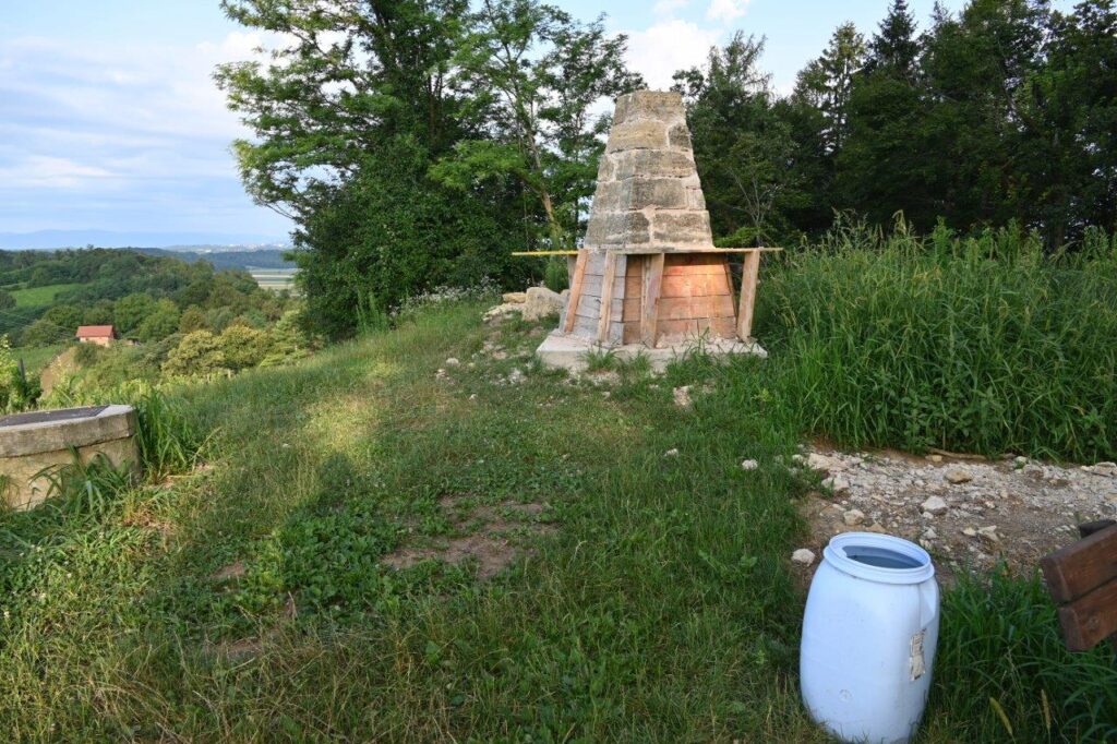 Dodala je, da je pred pričetkom gradbeno obnovitvenih del bilo potrebno najprej pridobiti soglasje lastnika zemljišča, na katerem znamenje stoji, to je Republika Slovenija, Sklad kmetijskih zemljišč in gozdov. Zaradi statike in v skladu s kulturno varstvenimi pogoji, se je znamenje prestavilo na novo lokacijo, le nekaj metrov vstran od dosedanje. Na novo je bila izgrajena betonska temeljna plošča. Spominsko znamenje se je nato s pomočjo strojev razstavilo na posamezne kamnite dele, ki so se na novo izgrajeni plošči, s pomočjo lesenega piramidastega kalupa, omislil in sestavil ga je Jože Ješovnik, piramido ponovno sestavili v celoto. Tekom obnovitvenih del se je ves čas zasledoval cilj: v največji možni meri ohraniti znamenje, kot je bilo v prvotni obliki.