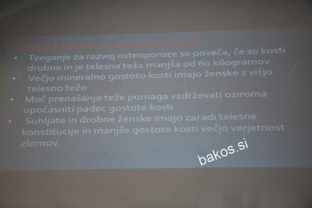 Osteoporoza je namreč stanje zmanjšane kostne mase, ki povzroča večjo možnost zlomov tudi pri manjših obremenitvah. In tega si res ne želi nihče med nami, kot je bilo slišati. Dejstvo je, da se v prvi polovici življenja kostna masa gradi (najmočneje do 20. leta), po 35. letu pa se, sploh pri ženskah, začne njen postopen upad. K temu pospešeno pomaga tudi menopavza zaradi manjšega nastajanja ženskih spolnih hormonov – estrogenov. Tako na nekatere dejavnike osteoporoze, kot so starost, spol in dednost, ne moremo vplivati. Spodbudna novica je, da obstajajo še drugi dejavniki, na katere pa lahko vplivate in tako osteoporozo preprečite ali vsaj omilite težave, ki zaradi te bolezni nastanejo. Za začetek je pomembno, da prenehate kaditi in prekomerno uživati alkohol ter pravo kavo, dovolj sta namreč največ dve skodelici kave. Kot je dejal dr. Triller, priporoča se tudi čim več gibanja, saj z aktivnostjo mišic, ki se pripenjajo na kost, spodbujate nastajanje kostne gostote…