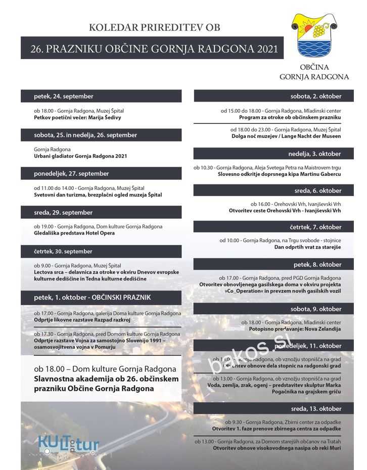 Praznovanje je razširjeno na daljše obdobje, saj se je začelo že prejšnji petek v muzeju Špital, ko je potekal literarni večer. V priloženem gradivu pa lahko preberete celoten program dogodkov v sklopu praznovanja praznika radgonske občine. Seveda je v ospredju jutrišnja svečana akademija s podelitvijo letošnjih občinskih priznanj, a tudi nedeljsko odprtje novega kipa v Aleji svetega Petra.