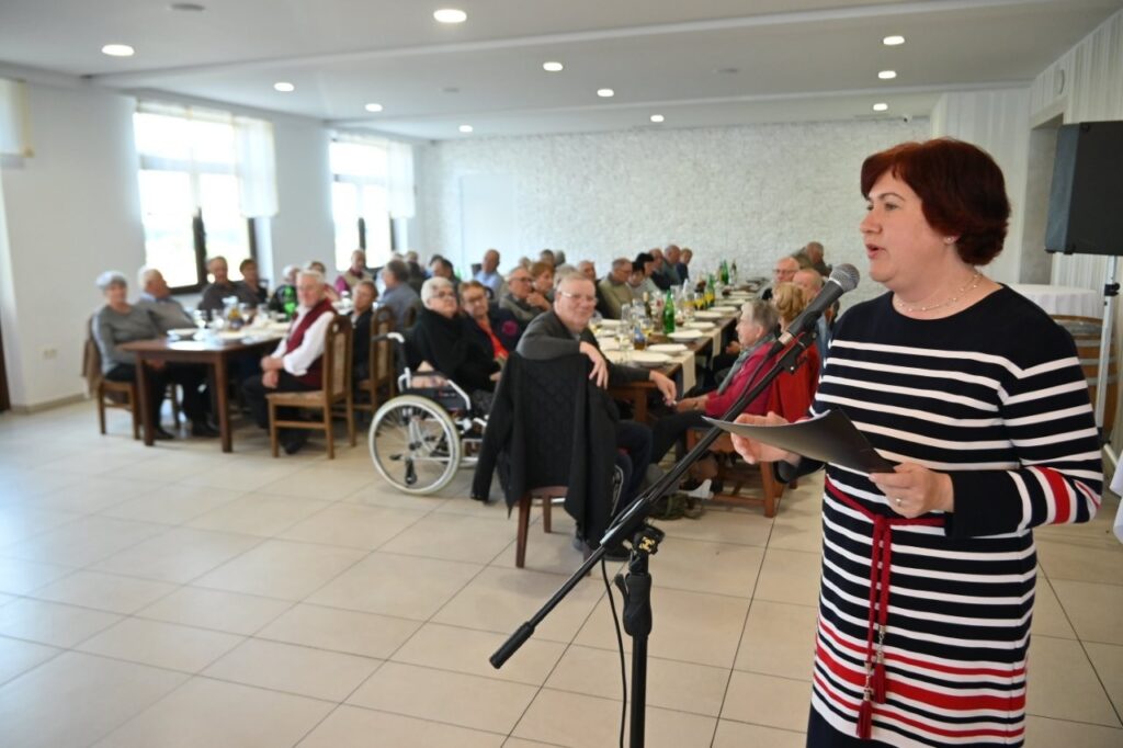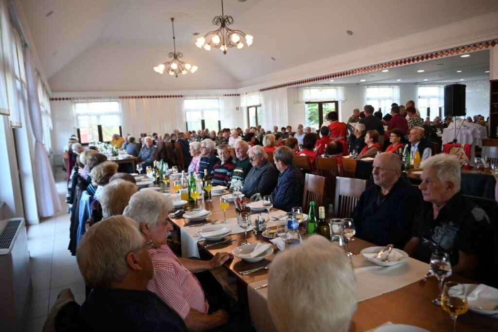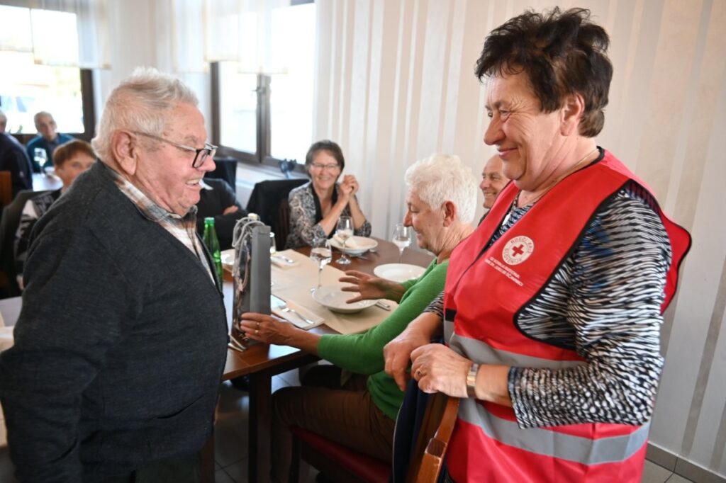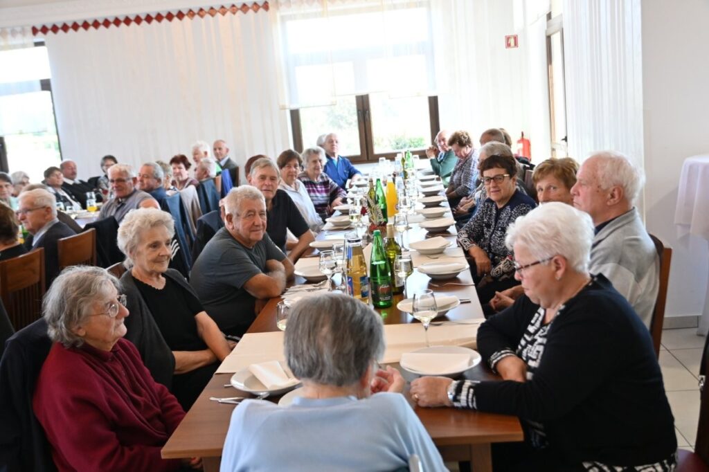 Krajevna organizacija Rdečega križa (KO RK) Sv. Jurij ob Ščavnici je, ob podpori domače občine, pripravila tradicionalno srečanje starejših občanov, ki so dopolnili najmanj 70 let. Srečanja, ki je potekalo v prostorih Gostilne pri Antonu na Jamni, se je udeležilo 151 starejših. Najstarejši med njimi je bil 97 – letni Roman Muhič iz Biserjan, kateremu je predsednica KO RK Sv. Jurij ob Ščavnici Cvetka Fiala, posebej čestitala in mu izročila darilo. Kakor vrsto let je prireditev za mikrofonom spet suvereno vodila mag. Polonca Fiala Novak, ki je po pozdravu prisotnih izrazila zadovoljsvo nad visoko udeležbo. „Veseli smo, da ste se odzvali povabilu, in da vam zdravje dopušča, da ste danes tukaj, na srečanju, ki ga vsako leto z veseljem pripravimo za vas. Danes smo se zbrali v toplem objemu jeseni – tiste letne življenjske jeseni. Jesen je čas, ko se narava umiri in obarva v zlato, sonce še posebej danes toplo sije in kašče so jeseni polne dobrot. Dragi naši starejši, vaša življenjska jesen pa je tudi čas, ko se ozremo nazaj na vaše opravljeno delo, skrbi, na prehojene poti, pa tudi na plodove vaših življenj, ki ste jih s trudom in srčnostjo darovali svoji družini, skupnosti in prihodnosti, ki jo danes živimo tudi mi…“