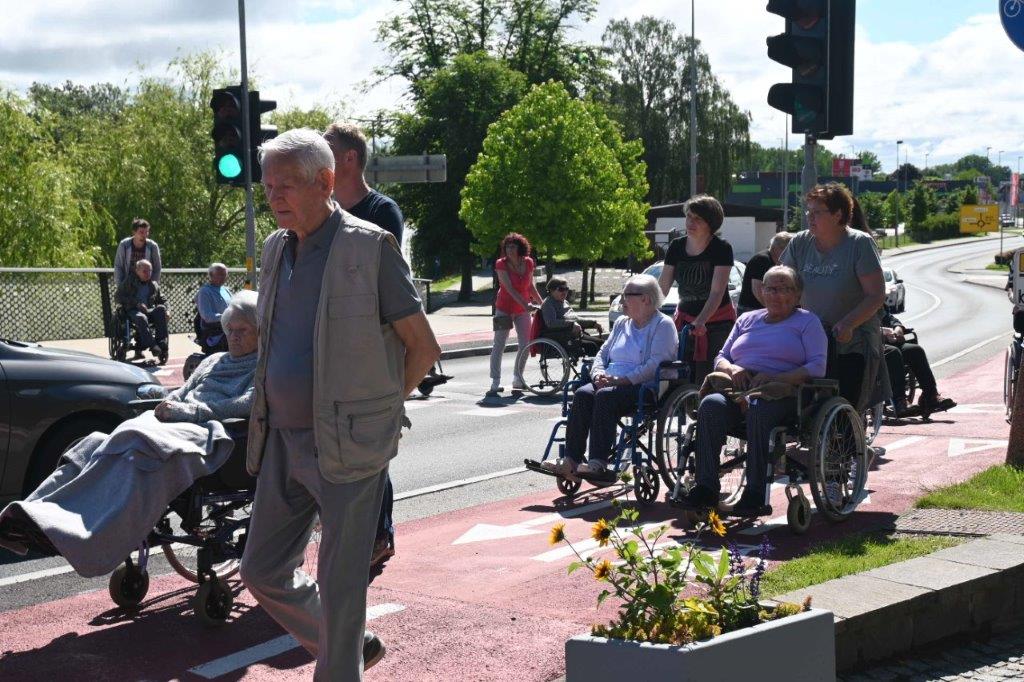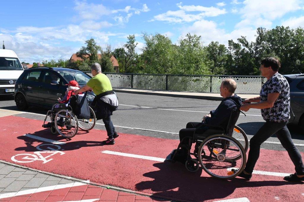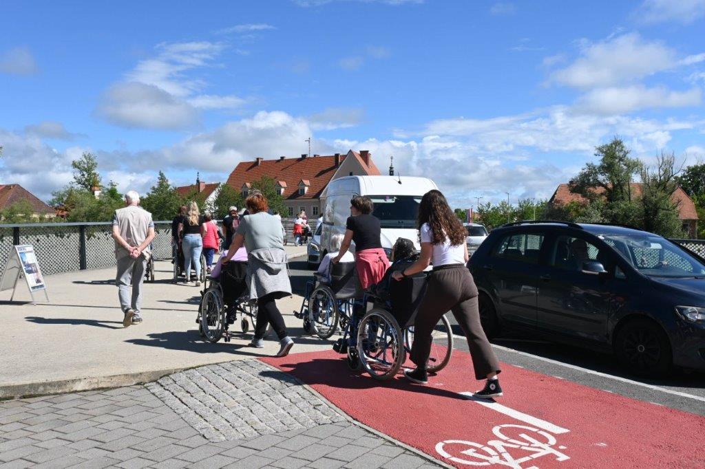 Kar veliko, več deset vozičkov se je, pod vodstvom delovnega terapevta Matjaža, v koloni podalo mimo mestnega park, nato se je kolona »vozičkarjev« in njihovih spremljevalcev, zaposlenih v domu oziroma bolj zdravih oz. gibalno neoviranih stanovalcev, vila po mestnih ulicah najprej do mostu na reki Muri, ter tamkajšnjega pristana in igrišč. Po krajšem klepetu pa naprej čez most, v Bad Radkersburg, kjer so se „sprehodili“ tudi po tamkajšnjih ulicah in mimo term, nazaj proti reki Muri in čez most v Gornjo Radgono. Po obisku Aleje velikih in cerkve sv. Petra, pa po Partizanski ulici do središča mesta in nato po Panonski in Mladinski ulici spet v mestni park, do doma starejših občanov, kjer jih je čakalo kosilo in kjer se vsi najlepše počutijo. Vsi udeleženci, tako tisti na vozičkih, kot tisti, ki so jim pomagali in tudi svojci, ki so se pridružili potepu, so ob vrnitvi bili zadovoljni, dobro razpoloženi in polni pohvalnih besed. Seveda so ob takšnem zadovoljstvu stanovalcev, veseli bili tudi zaposleni v domu, ki so bili zraven na prijetnem potepu.