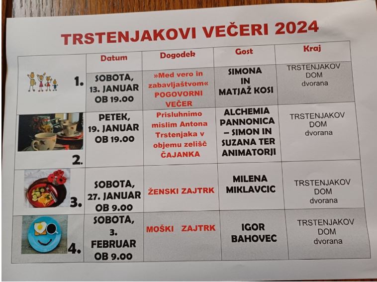 Začetek letošnjih Trstenjakovih večerov bo v soboto, 13. januarja. Nadaljevanje bo v petek 19. januarja. V soboto 27. januarja bo tako imenovani Ženski zajtrk in v soboto 3 februarja še Moški zajtrk. Iz priloge je razviden celotni razpored letošnjih Trstenjakovih večerov. (F.K.)