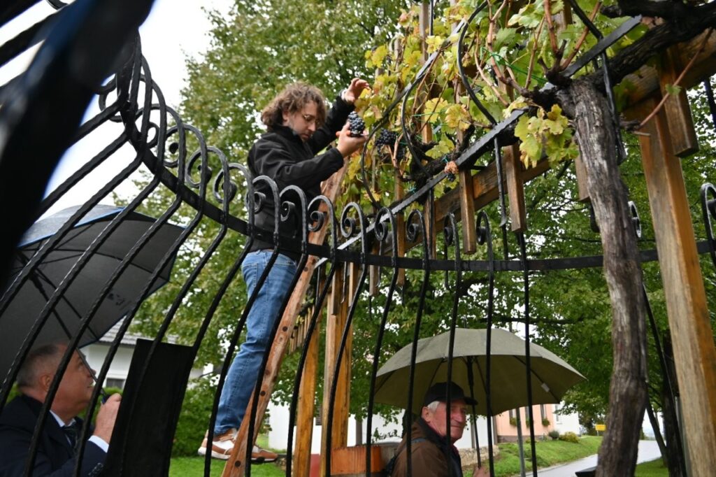 Potomka 450 letne modre kavčine letos v Cerkvenjaku slabo obrodila, a trgatev ni preprečil niti dež