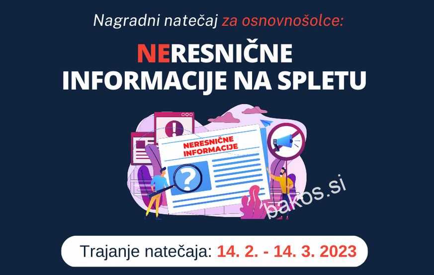 K prijavi na nagradni natečaj vabimo osnovnošolke in osnovnošolce, ki želijo s svojimi umetniškimi in ostali kreativnimi izdelki v digitalni obliki na poseben način osvetliti tematiko neresničnih informacij na spletu. Natečaj poteka od 14. februarja do vključno 14. marca 2023. Na natečaju lahko sodelujejo vsi učenci osnovnih šol in osnovnih šol s prilagojenim programom. Učenci naj se individualno prijavijo prek elektronskega naslova natecaj.mdp@gov.si s prijavnico, dostopno na koncu te novice.