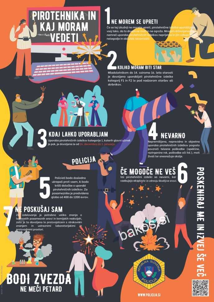 Pred nami so dnevi, ko se nekateri ne boste mogli upreti uporabi pirotehnike. Če ste med njimi, pirotehnične izdelke uporabljajte tako, da pri tem ne boste ogroženi ter da ne boste ogrožali in motili drugih. Pri nas je pirotehnične izdelke, katerih glavni učinek je pok, dovoljeno prodajati le med 19. in 31. decembrom, uporabljati pa od 26. decembra do vključno 1. januarja. Pri tem velja poudariti da posest in uporaba petard vseh oblik in moči, v Sloveniji ni dovoljena. Vsi pirotehnični izdelki, ki so naprodaj v Sloveniji morajo biti ustrezno označeni in opremljeni z deklaracijo v slovenskem jeziku, da je zagotovljena sledljivost. Zaradi kršitev določil lahko policisti posamezniku izrečejo globo v razponu od 400 do 1.200€ ter mu zasežejo pirotehnične izdelke, četudi niso njegova last.