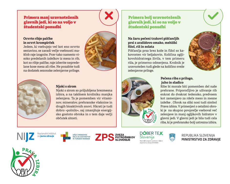 Redna izpostavljenost tovrstni energijsko bogati, a hranilno revni hrani v kombinaciji s pomanjkanjem telesne dejavnosti pomembno prispeva k naraščajočemu trendu prekomerne telesne mase, debelosti in drugih kroničnih nenalezljivih bolezni med mlajšo odraslo populacijo. V okviru projekta »Dober tek, študent!«, sofinanciranega s strani Ministrstva za zdravje, se je oblikoval sistem označevanja prehransko ustreznejše ponudbe s simbolom »Prava izbira«. Slednji študentom omogoča lažjo prepoznavnost zdravih in uravnoteženih študentskih obrokov. Simbol, ki ga podeljuje Nacionalni inštitut za javno zdravje skupaj s Turistično gostinsko zbornico Slovenije, študentom zagotavlja, da je njihov obrok količinsko in energijsko primeren, ima uravnoteženo sestavo in ustrezen način priprave. Simbol lahko pridobijo tudi ponudniki, ki niso del subvencionirane študentske prehrambne.