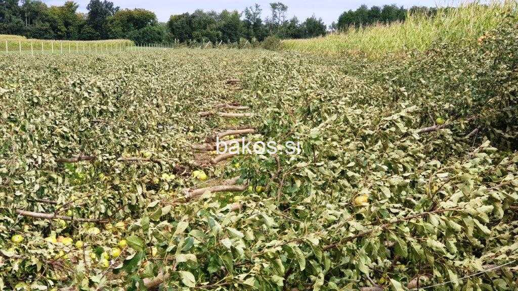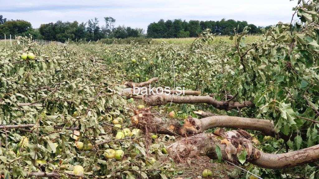 Če odštejemo na desetine in celo stotine uničenih in poškodovanih objektov, vozil, cest, električnih drogov, podrtih dreves…, je včerajšnje neurje v Prlekiji največ preglavic povzročilo vinogradnikom in sadjarjem. Tako je med drugi, samo v enem sadovnjaku iz Razkrižja bilo uničeno za 75 ton uničenega pridelka, škoda po prvih ocenah znaša okoli 80.000 evrov. Potem, ko si je že v nedeljo zvečer in ponoči žalostno ogledoval vse kar je naravna ujma počela ljudem tik pred obiranjem pridelka, si je župan občine Razkrižje Stanislav Ivanuša, v ponedeljek dopoldan, ogledal še škodo v sadovnjakih. Kot je nato sporočil, je največjo škodo, kar je zaenkrat ugotovljeno na terenu, utrpela Sadjarska kmetija Šarčevič iz Razkrižja, ki ima ob drugih sadovnjakih, en del na slovenski strani, tik ob Mejnem prehodu Gibina. Po podatkih župana je 5 letni nasad v celoti uničen. Na površini 1,2 ha površine je zasajenih 4000 dreves, celotna škoda z uničenimi drevesi in konstrukcijo znaša okoli 50 tisoč evrov, uničenega pridelka pa je za 75 ton, kar znese okoli 30 tisoč evrov, je zapisal župan. S tem je samo v tem sadovnjaku za okoli 80 tisoč evrov škode. „Škodo sem si ogledal osebno in tudi strokovna komisija občine. Fotografije pa povedo vse,“ je dejal župan.
