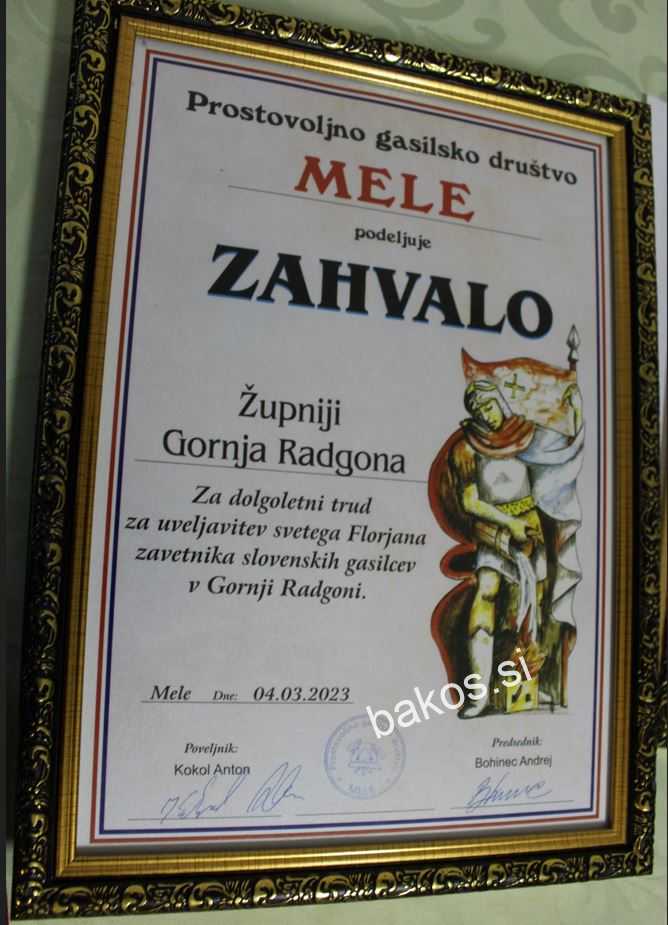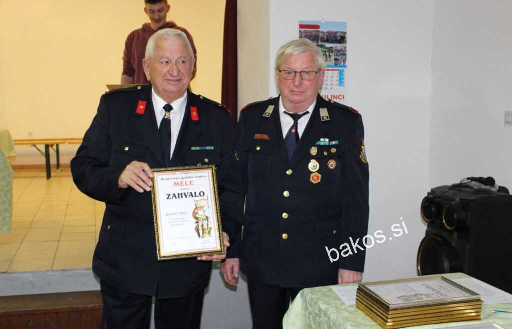 Na občnem zboru so podelili skoraj 30 različnih priznanj in zahval. Med prejemniki zahvale je bila tudi Župnija svetega Petra Gornja Radgona. Po zaslugi župnijskega občestva se namreč na Meleh vrši ob Florjanovem (4.maj) darovanje svete maše za gasilce. Teh maš se udeležuje tudi nekaj gasilcev sosednjih društev. Po občnem zboru je sledilo druženje ob prigrizku, ki so ga pripravili gostinci iz Turistične kmetije Hari iz Spodnje Ščavnice. Seveda ni manjkalo niti tekočih dobrot, vsega tega pa so bili deležni prav vsi udeleženci zbora. (F.K.)