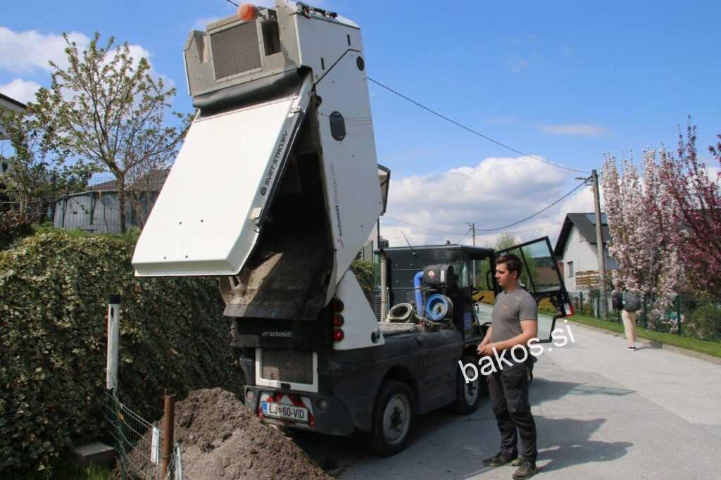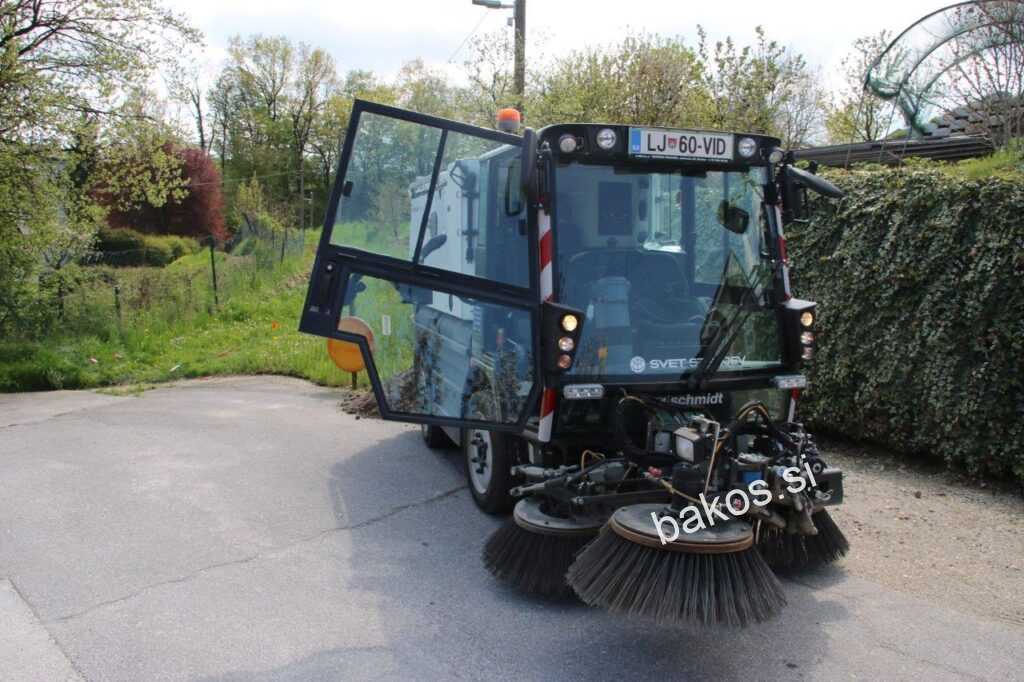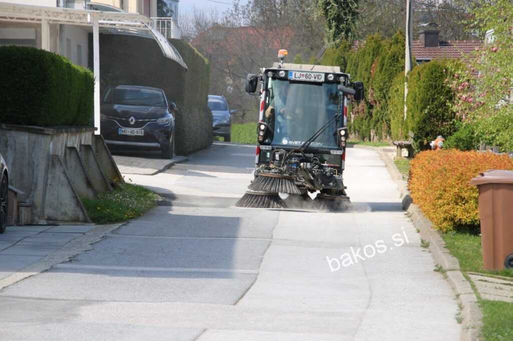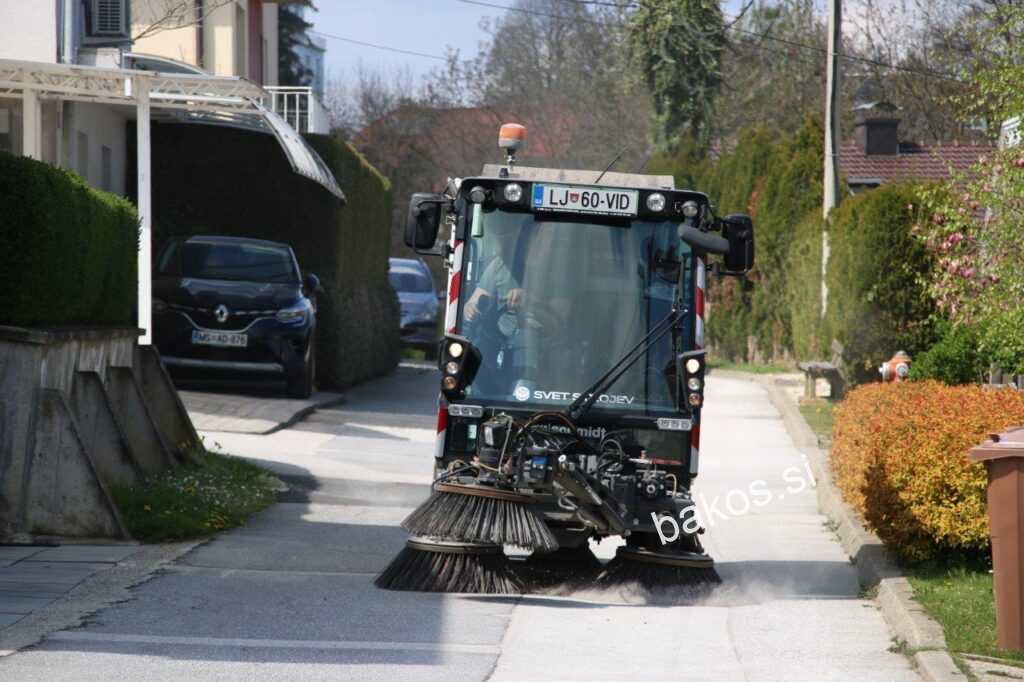 Na Šlebingerjevem bregu smo fotografirali stroj in delavca, ki z njim upravlja, to je Luka Hamler, ki nam je o stroju povedal: »Kot vidite je stroj zelo moderen. S svojimi ščetkami dodobra očisti cesto, material pesek in smeti pa transportira zbirni pokriti keson. Stroj, katerega vrednost je okoli 90.000 evrov, ima podjetje na preizkušnji.« (L.K.)