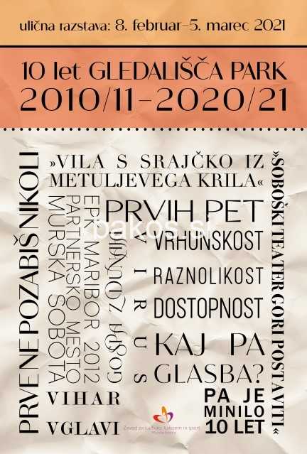 Pred stavbo Gledališča Park v Murski Soboti bo od ponedeljka, 8. februarja do petka, 5. marca 2021, na ogled zanimiva ulična razstava posvečena obeležitvi desetletnice omenjenega soboškega kulturnega hrama. Kot poudarja Natalija Kreft odgovorna za turizem in promocijo pri Zavodu za kulturo, turizem in šport Murska Sobota, bo „Ulična razstava s kratkimi besedili in izbranimi fotografijami na dvanajstih plakatih ponudila sprehod skozi prvo dekado prenovljenega Gledališča Park; od prve predstave odigrane 6. decembra 2010, oziroma uradne otvoritve 8. februarja 2011, do 17. oktobra lani, ko smo se zaradi ponovno razglašene epidemije ustavili pri številkah: 2035 dogodkov in nekaj več kot 450.000 obiskovalcev. Vmesni postanki ponujajo razmislek o tem kaj, kako in zakaj smo počeli, kar smo počeli v prvih desetih letih, da je Gledališče Park postalo vsaj tako priljubljen urbani kulturni prostor, kot je to bil Kino Park v svojih najboljših časih; kar ni tako samoumevno, kot se morda komu zdi – lahko bi se izteklo tudi zelo drugače“.