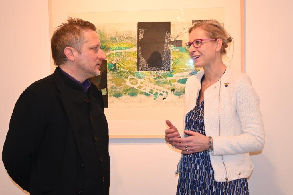 Gederja in njegovo delo je nato predstavila ugledna kustosinja in muzejska svetnica, mag. Breda Škerjanc, ki je med drugim povedala, da je Geder na slovenski umetniški sceni prepoznaven grafik srednje generacije, katerega odlikujeta edinstvena estetika in izraznost. Njegova umetnost se giblje med abstrakcijo in figuraliko, h kateri se čedalje bolj nagiba ter nam s tem ponuja svobodo in možnost, da sami oblikujemo svoj pogled in doživetje. Njegova posebnost je tehnika, ki jo je poimenoval monoprint, ti praviloma nastajajo stopenjsko. „V čast in privilegij mi je, da danes stojim pred vami, ko praznujemo delo tega na slovenski umetniški sceni zelo prepoznavnega grafika. Njegovo delo spremljam od razstave Odtisi in vtisi I, ki je bila v MGLC leta 2012, kjer smo tudi v Ljubljani prepoznali njegov talent za grafiko, ga dve leti kasneje vključili v selekcijo slovenskih grafikov za grafični bianale v Sofiji in štiri leta kasneje, skupaj pripravili razstavo v MGLC z naslovom: Priprave na improvizacijo. Naše zadnje sodelovanje se je končalo septembra lani, ko se je v Novi Gorici zaključila sedma, zadnja etapa potujoče razstave slovenskih grafikov vseh generacij Sodobno je enako sveže,“ je med drugim dejala Škerjančeva, ki je dodala, da Gederja ne oblikuje le edinstvena estetika, temveč tudi iskrena izraznost, ki je vgrajena v njegovo umetnost. „Med potepanjem po tej razstavi ne cenimo le lepote Gederjeve umetnosti, temveč upoštevamo tudi sporočila, ki jih posreduje. Naj nas njegovo delo navdihne k iskanju globljega razumevanja sebe in sveta okoli nas,“ je zaključila Breda Škerjanec, ki je prisotne pozvala k ogledu razstave z naslovom Dve šoli, ki bo na ogled vse do dneva žena, 8. marca, na najej pa so poleg Gederjevih na ogled tudi dela nekaterih njegovih učencev in hčerke Ane.