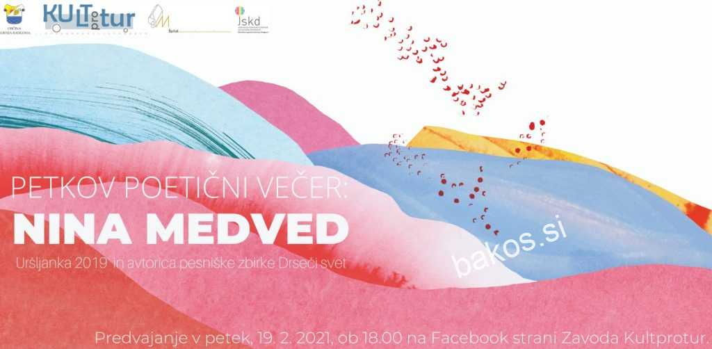 Javni sklad kulturnih dejavnosti (JSKD), Območna izpostava Gornja Radgona, skupaj z Zavodom za kulturo, promocijo in turizem Kultprotur, tudi v letošnjem letu nadaljuje s petkovimi poetičnimi večeri, kjer se bo vsestranska domača kulturna ustvarjalka Nika Škof pogovarjala z že uveljavljenimi pesniki in pisatelji. In v prvem letošnjem poetičnem večeru bodo ljubitelji literature in vsi drugi zainteresirani, lahko prisluhnili pogovoru z „Uršljanko 2019“ (Zmagovalka Festivala mlade literature Urška 2019 op.p.), Nino Medved. Gre za umetnico zapriseženo besedi kot pesnica, prevajalka, performerka, literarna producentka in urednica; zaprisežena svetlobi kot fotografinja. V letu 2020 je mimogrede pridobila podporo Ministrstva RS za kulturo in Mestne občine Maribor v obliki delovnih štipendij. Pred dnevi je med drugim bila slavnostna govornica na osrednji proslavi kulturnega praznika v Mestni občini Maribor.