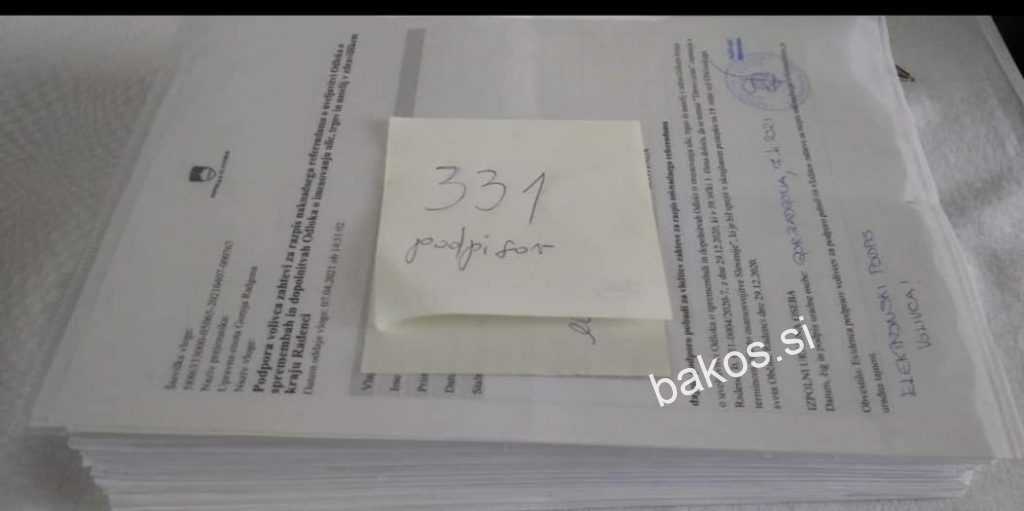 „Županu oz. njegovi pooblaščenki na Občini Radenci smo danes oddali 331, od zahtevanih 219 overjenih podpisov, zahtevanih v podporo referendumu proti preimenovanju Titove ceste v Radencih! 5% zahtevano kvoto vseh volilnih upravičencev v občini (teh je bilo na zadnjih volitvah 4388) smo presegli za 51%, čeprav je bilo treba podpise overiti na Upravni enoti Gornja Radgona. Podporo referendumu je tako podpisalo 7,5% vseh volilnih upravičencev v občini Radenci! Spomnimo, da je Ustavno sodišče RS letos januarja sklenilo, da se že sprejeti odlok o preimenovanju zadrži do odločanja na referendumu, Upravno sodišče pa februarja sklenilo, da so vsi naši postopki v zvezi z referendumsko pobudo v skladu z zakonom in upravičeni. Enako sta obe sodišči odločili že lansko leto“, so sporočili iz skupine Enotni ZA občino Radenci.