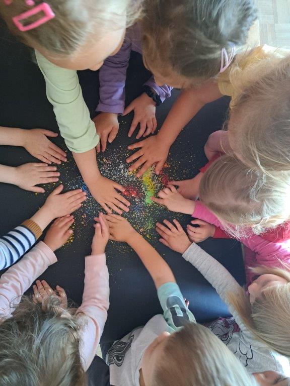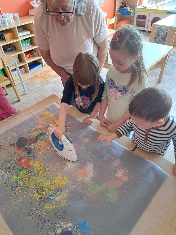 Pred kratkim nas je v oddelku 3-4 let, enote Kocljeva 2 Vrtca Manka Golarja Gornja Radgona obiskala predsednica Likovnega društva Gornja Radgona Danica Štrucelj in nam obogatila likovno dejavnost. Otrokom je na zanimiv, nevsakdanji način predstavila inovativni pristop k likovni tehniki. Ribali smo stare voščenke in jih s sušilnikom za lase in likalnikom topili na karton in paus papir. Otrokom smo s to dejavnostjo pričarali spodbudno učno okolje, kjer so lahko doživljali umetnost kot celoto in razvijali občutek za kakovostno umetniško izkušnjo.