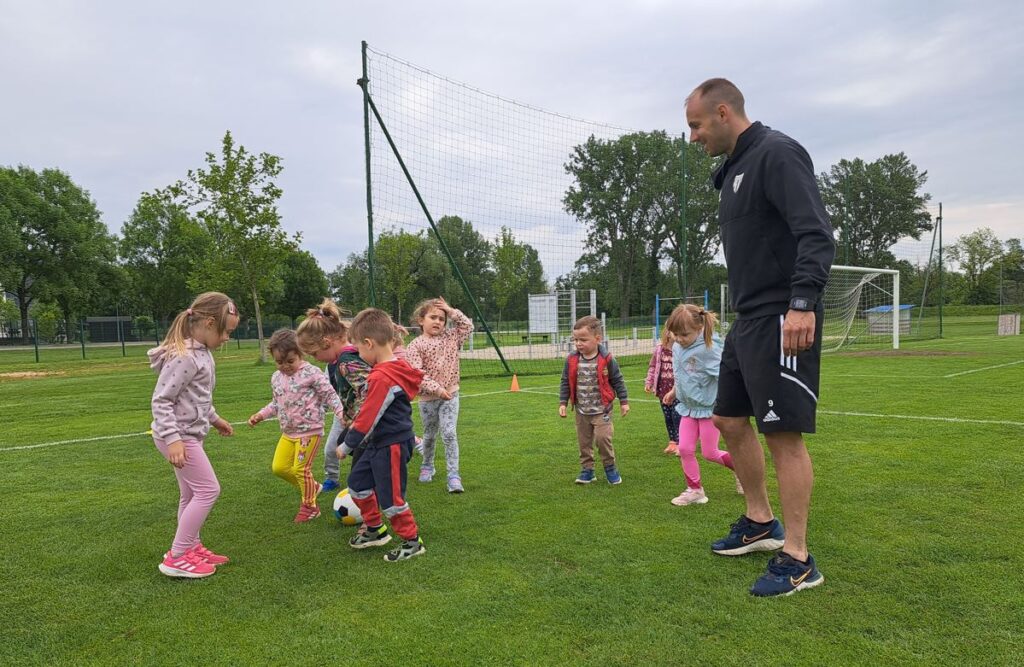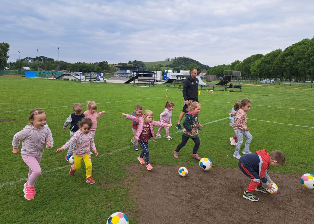 Področje gibanja kot prednostno področje v našem vrtcu, prav tako v oddelku, pomembno vpliva na načrtovanje aktivnosti, z vidika razvijanja gibalnih spretnosti in sposobnosti ter povezovanje gibanja z vsemi ostalimi področji kurikuluma. V našem oddelku smo si želeli okrepiti sodelovanje s starši in ga popestriti z gibalno aktivnostjo, zato smo k sodelovanju povabili nogometaša NŠ Mura, gospoda Matica Maruška, ki ima v oddelku hčerko. Seveda se je z veseljem odzval našemu povabilu. Dogovorili smo se, da izvedemo nogometni »trening« za otroke.
