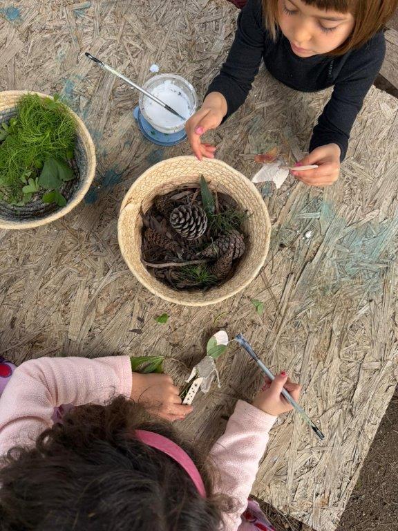 Opazovale smo tudi raziskovanje okolice vrtca, kjer so otroci iskali znanilce pomladi ter spoznavali spremembe v naravi. Učenje je potekalo spontano, skozi opazovanje, pogovor in gibanje. Poseben poudarek namenjajo tudi gibalnim dejavnostim za povezovanje skupine ter ustvarjalnosti. Ob branju pravljice na temo karnevala so otroci izdelovali maske iz naravnih materialov. Igralno okolje je preprosto, a izjemno spodbudno. Veliko igral je izdelanih iz recikliranih materialov, kot so lesene palete, koluti, debla in pnevmatike. Igrače so večinoma naravni materiali (palice, kamni, trava) ali odsluženi predmeti (stare ponve, posode), ki otrokom omogočajo domišljijsko in ustvarjalno igro.