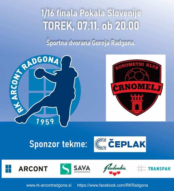 Po kar štirih domačih prvenstvenih tekmah v 2. SRL, sedaj rokometaši Arcont Radgona igrajo v domači dvorani še pokalno tekmo. V 1/16 finala Pokala Slovenije namreč Radgončani gostijo ekipo Črnomlja, ki trenutno zaseda 10. mesto v 1.B ligi. Torej ljubiteljem rokometa se v torek, 7.11.2023, ob 20. uri, obeta ogled tekme proti “prvoligašu”.