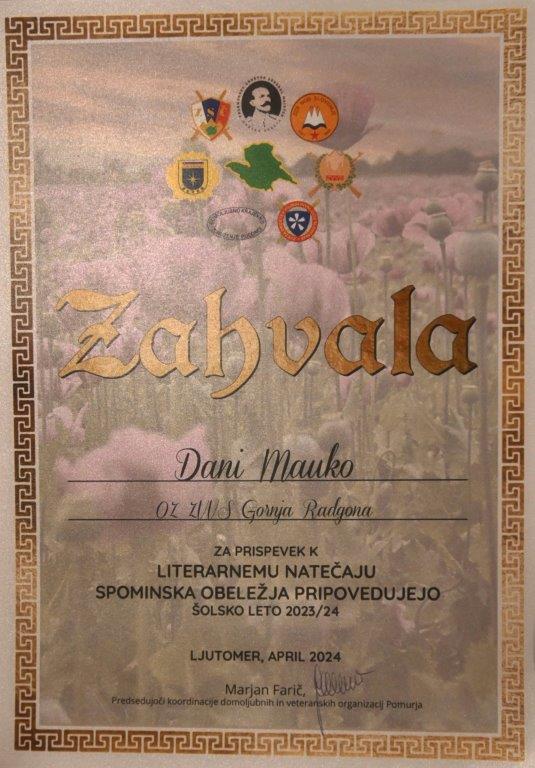V sodelovanju z občino Ljutomer so domoljubne in veteranske organizacije Pomurja izvedle zaključno prireditev 6.literarnega natečaja “Spominska obeležja pripovedujejo za šolsko leto 2023/24”. Na zaključni slovesnosti, ki je potekala v Domu kulture v Ljutomeru, je zbrane uvodoma pozdravila ljutomerska županja, mag. Olga Karba, slavnostni govornik pa je bil ravnatelj Gimnazije Frana Miklošiča Ljutomer, Franci Čuš.