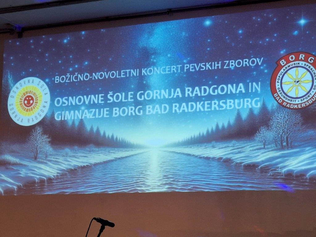 V avli Osnovne šole Gornja Radgona je minuli petek zvečer potekal tradicionalni božično novoletni koncert, na katerem so nastopili pevski zbori radgonske osnovne šole in Gimnazije Borg iz Bad Radkersburga. Mladi pevci in pevke, s svojimi mentorji so uprizorili zelo kakovosten koncert, katerega sta strokovno vodila učitelja tukajšnje šole Janja Šinko Borovšak in Kristjan Borovšak, Prisluhnili so jim številni obiskovalci, med njimi je bilo največ staršev, starih staršev in drugih sorodnikov nastopajočih, zraven pa sta med drugimi gosti, bili tudi županja občine Gornja Radgona Urška Mauko Tuš in poslanka Državnega zbora RS Vera Granfol.