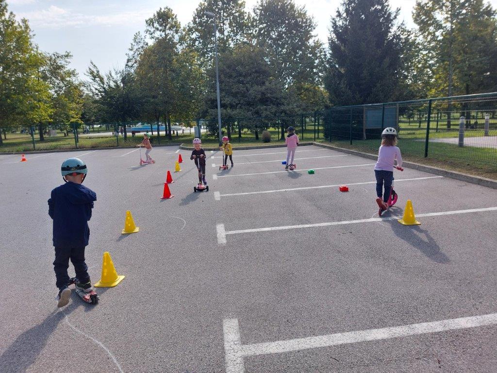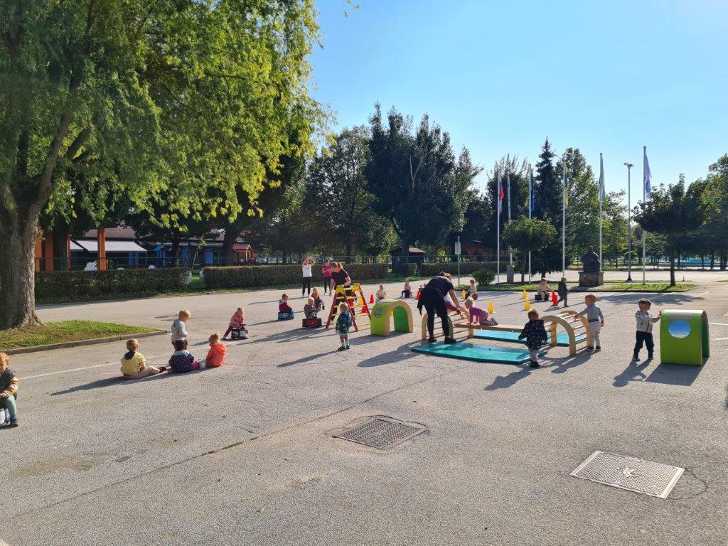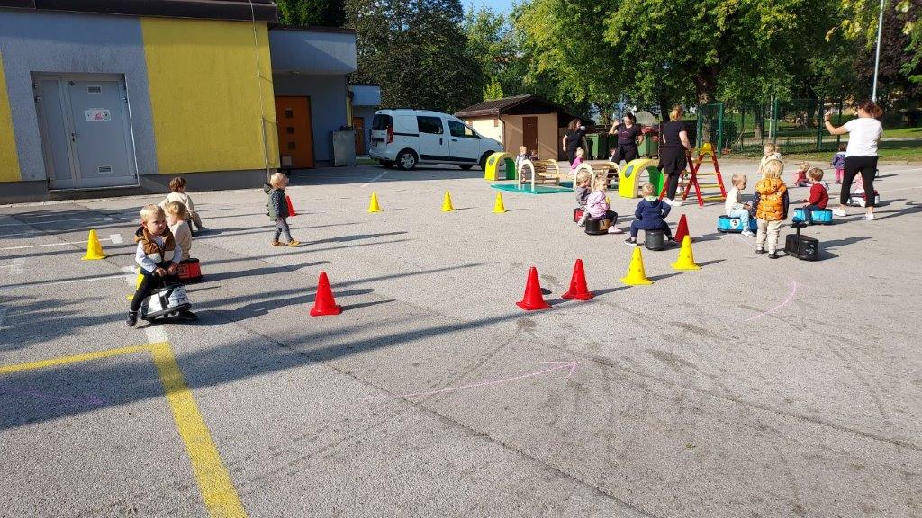 Otroci prvega starostnega obdobja so se razgibavali na poligonu, katerega so jim pripravile vzgojiteljice na asfaltni površini pred vrtcem. Plazenje, plezanje, kotaljenje, kobacanje, valjanje po blazinah in še kaj so narisali nasmehe na obraze naših malčkov. Nekateri večji so zbrali pogum ter se pomerili na spretnostni vožnji s kolesi, skiroji in poganjalčki. Bili so pravi mali udeleženci v prometu in kar je pohvalno – vsi so prinesli v vrtec varnostne čelade. Strokovne delavke drugega starostnega obdobja smo ob pomoči otrok pripravile različne gibalne poligone, kjer so imeli otroci možnost izvajanja najrazličnejših oblik gibanja. Uporabljali smo različne rekvizite – keglje, obroče, padalo, stožce, klobučke… Zahtevnost iger, vaj in poligona smo prilagodili glede na starost in razvoj otrok. Ni manjkalo niti glasbe in plesa.
