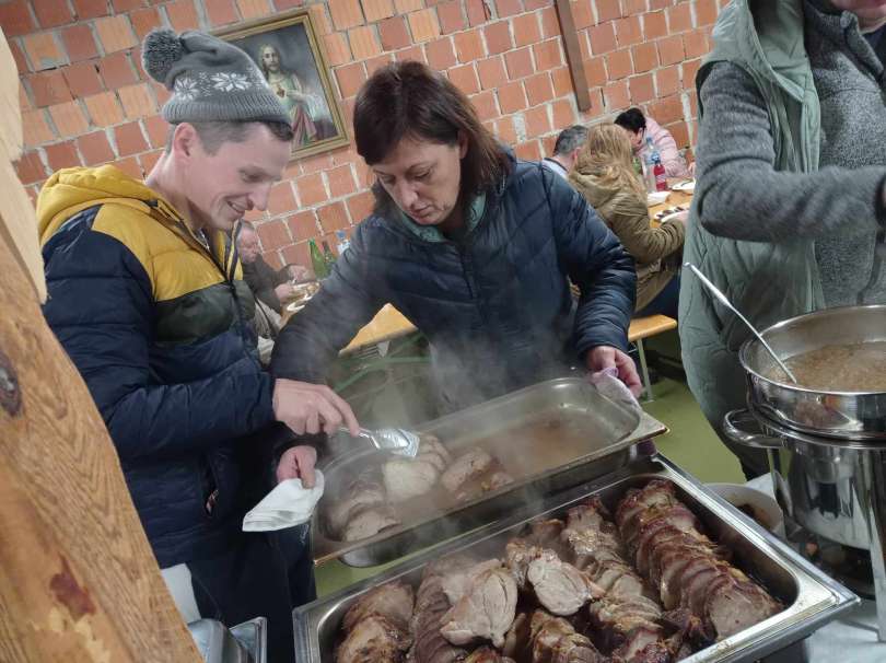 Konec koncev, če imajo krajani domači praznik – koline, zakaj jih ne bi imeli tudi na nivoju župnije, so si pred leti omislili v župniji Markovci na Goričkem. „Skupina ‘župnijskih kuharjev’ je naredila vse, kar je potrebno, od klanja, do priprave krvavic, kašnic, klobas, salam, ocvirkov, žolce, kosanja mesa in priprave za zamrzovalnik, prekajevanje, tünko in tako naprej,” pojasni markovski župnik Dejan Horvat, ki je tudi letos s kolinami pogostil več kot 200 faranov in gostov. Sicer pa na mizah ni manjkalo zelja, repe in drugih dobrot, ki so teknile ob sveži pečenki. Seveda, pa smo se lahko posladkali tudi z drugimi domačimi dobrotami. „Vrata na župnijske koline so odprta vsem. Tudi koline so nastale iz enega razloga, torej ohranjaje tradicije in da v hiši ostane nekaj mesa za velikonočni zajtrk. Pride pa tudi veliko ljudi od drugod in faranom ta dogodek kar nekaj pomeni. Na kolinah smo postregli s prekmurskimi dobrotami, značilnimi za koline. In tako je v Markovcih tudi tokrat na dan kolin bilo kajpak veselo in zabavno ter je vse sledilo po točno takem sosledju kot nekoč,“ je razložil priljubljeni župnik Dejan Horvat, ki je bil pred leti tudi pobudnik zanje in tudi tokrat je imeli vse niti kolin v svojih rokah. Veliko vlogo pri organizaciji kolin je imela tudi dolgoletna katehetinja v domači Markovski župniji, in v Kančevcih ter občasno v Gornjih Petrovcih, Jožica Časar, ki je mimogrede tudi vodja župnijskega karitasa in članica ŽPS…