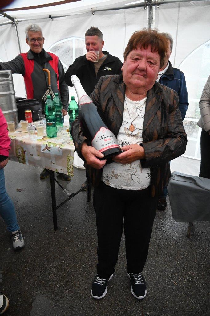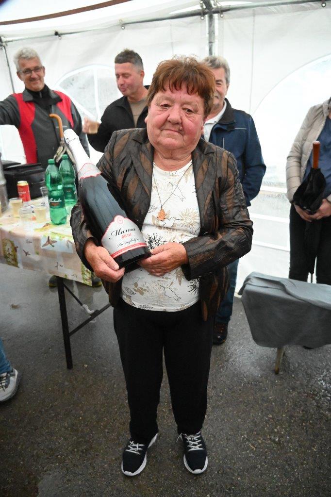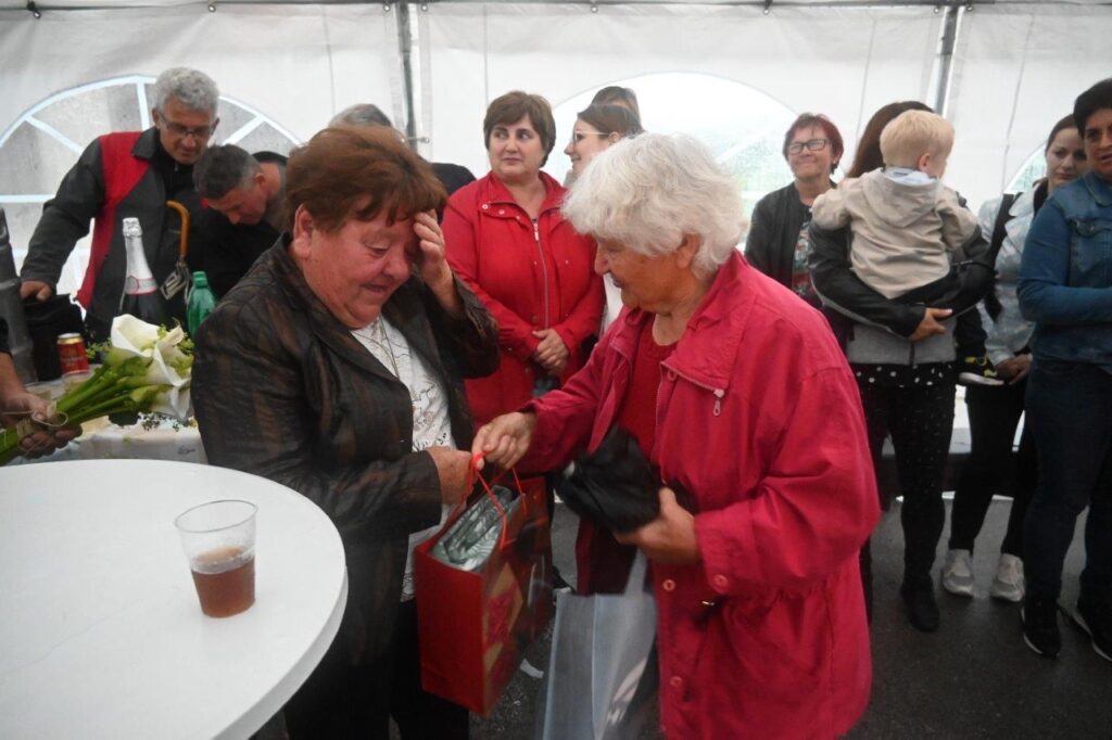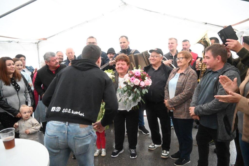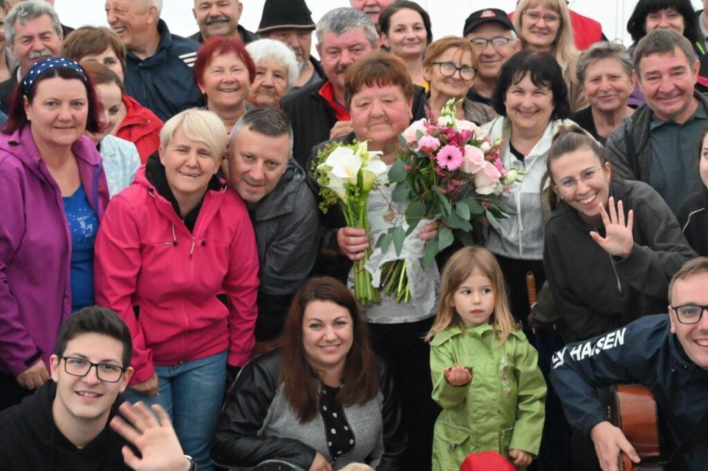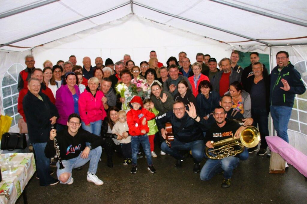 Ko so se zbrali v šotoru, ki sta ga postavila Andrej in Vojko Jaušovec iz Štajngrove pri Benediktu, so Mladih 5 zaigrali in s svojim nastopom povabili slavljenko med udeležence slavja. V dežju pod dežnikom, jo je iz njene hiše v prireditveni šotor pripeljal sin Tonč. Ko je zagledala množico obiskovalcev prireditve in slišala igranje Ansambla Mladih 5, so ji na oči prišle solze sreče. Ni mogla skriti presenečenja, ki so ji ga pripravili za njen rojstni dan. Tudi ni mogla skriti čustev sreče, ki jih je doživela ob tolikšni množici obiskovalcev in melodijah, ki sojih v njeno čast izvajali člani ansambla. Svojo veselje je izrazila tudi na tak način, da je ob igranju ansambla tudi zaplesala. Ni treba posebej poudarjati, da so se odvijale tudi zdravljice z vinsko kapljico, ki so jo prispevali bližnji in daljni vinogradniki. Za pogostitev pa so poskrbeli domači, s sladkarijami pa tudi udeleženke srečanja, S slavljenko so nazdravljali tudi s penino iz velike več litrske steklenice. Druženje se je nadaljevalo v veselem razpoloženju, kjer je svoje veselje izražala tudi slavljenka, ki je sicer vedno vesela in nasmejana.