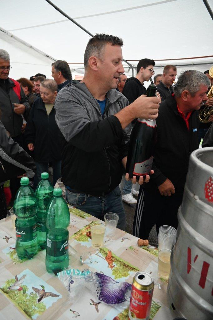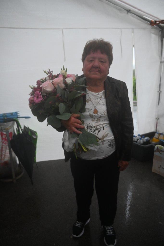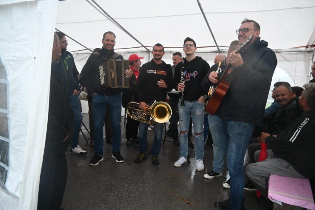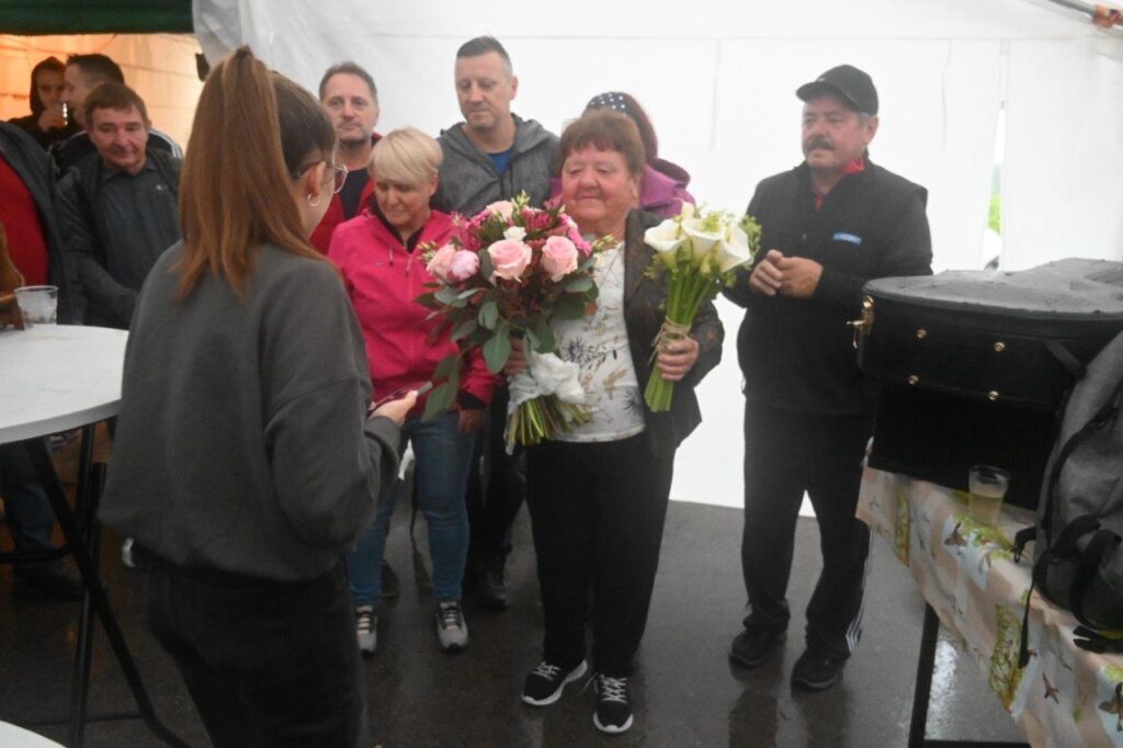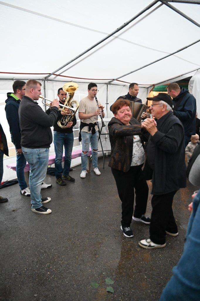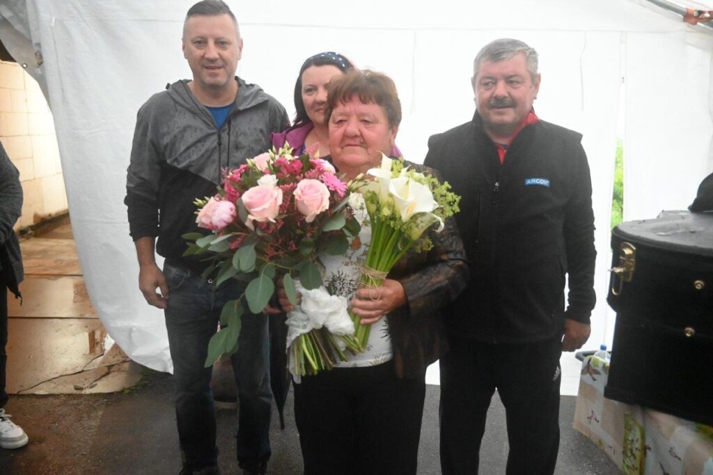 Ko so se zbrali v šotoru, ki sta ga postavila Andrej in Vojko Jaušovec iz Štajngrove pri Benediktu, so Mladih 5 zaigrali in s svojim nastopom povabili slavljenko med udeležence slavja. V dežju pod dežnikom, jo je iz njene hiše v prireditveni šotor pripeljal sin Tonč. Ko je zagledala množico obiskovalcev prireditve in slišala igranje Ansambla Mladih 5, so ji na oči prišle solze sreče. Ni mogla skriti presenečenja, ki so ji ga pripravili za njen rojstni dan. Tudi ni mogla skriti čustev sreče, ki jih je doživela ob tolikšni množici obiskovalcev in melodijah, ki sojih v njeno čast izvajali člani ansambla. Svojo veselje je izrazila tudi na tak način, da je ob igranju ansambla tudi zaplesala. Ni treba posebej poudarjati, da so se odvijale tudi zdravljice z vinsko kapljico, ki so jo prispevali bližnji in daljni vinogradniki. Za pogostitev pa so poskrbeli domači, s sladkarijami pa tudi udeleženke srečanja, S slavljenko so nazdravljali tudi s penino iz velike več litrske steklenice. Druženje se je nadaljevalo v veselem razpoloženju, kjer je svoje veselje izražala tudi slavljenka, ki je sicer vedno vesela in nasmejana.
