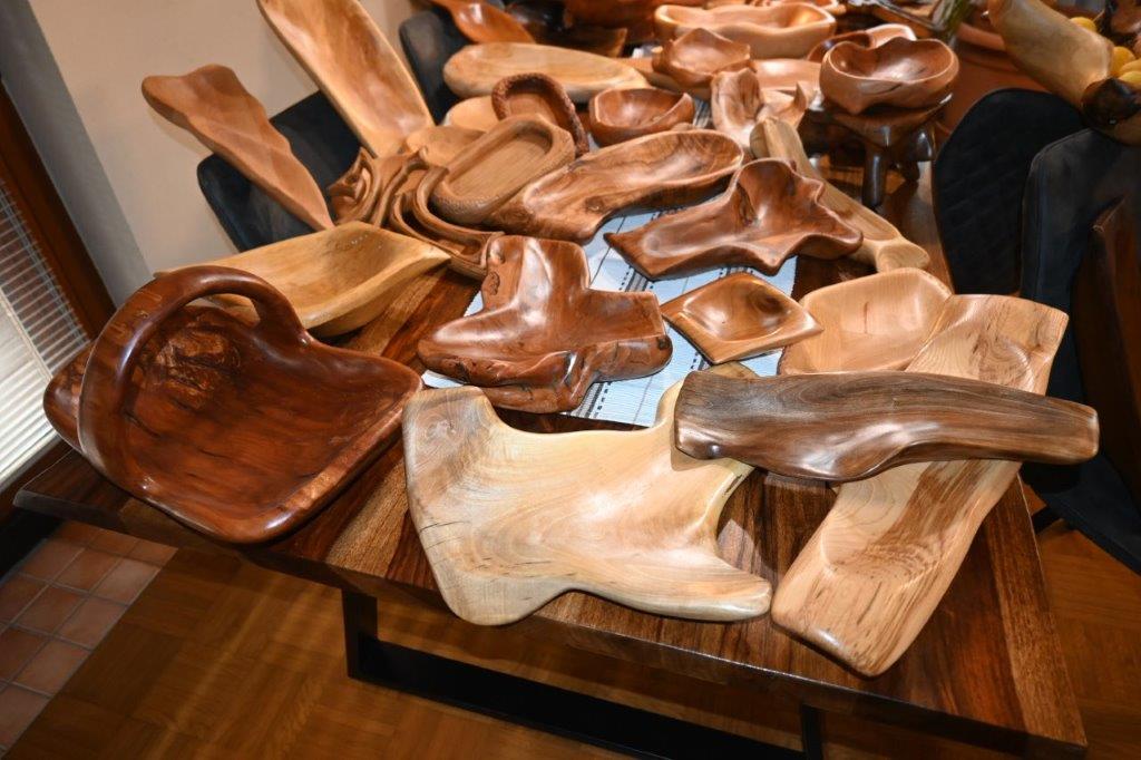 Mitja nam je razložil,da je zelo pomembno kakšen les uporabljaš in on skuša vedno najboljšega, kjer je za okrasne predmete med najboljšimi tudi les oljke. Vesel je vedno, ko ga kdo opozori, da podira kakšna redkejša drevesa, katerih se les lahko uporabi, po drugi strani pa običajno konča kot kurjava ali pa trohni nekje ob robu. Zato je hvaležen vsem, ki mu sporočijo, da podirajo drevesa, večina jih že sama pripelje kakšen zanimiv kos lesa, celo s traktorjem če gre za večje kose. Nekateri les, zlasti iz oljke. Sam izdeluje predvsem okrasno posodo za sadje, pladnje za narezke in podobne reči, če pa naleti na kakšen ustrezen kos lesa, tudi zahtevnejše predmete kot so ure, stojala, različne kipe, čeprav je v njegovem pestrem programu pravzaprav vse zahtevno. Vse namreč dela ročno, ni nobenega kalupa, ne stružnice ali žage, torej tudi brez uporabe električnega orodja. „Večinoma delam po lastni izbiri, odvisno kaj vidim v lesu, nekaj pa tudi po željah strank,“ pove Mitja, ki za vsak predmet porabi veliko časa, ker je vse zahtevno delo, ki ga poleg njega izvajajo tudi „tri domača dekleta“, in ker gre za dopolnilno dejavnost, se tudi zaslužek oz. dobiček deli, kot pove med smehom. Poleg lesa, ki ga je potrebno plačati, je vsekakor največji strošek sta brusni papir, katerega je potrebno največ in seveda zaščitna sredstva, za delo pa ostane bolj malo. Mitja sam sicer ne šteje vseh izdelkov, večinoma gre za dejanske umetnine, pravi pa, da tukaj ne gre toliko za kvantiteto, temveč za kvaliteto.