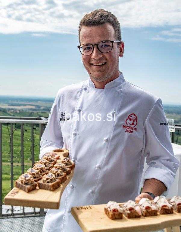 Večerja zasleduje idejo prestižnega 5-zvezdničnega doživetja. Želja organizatorja je privabiti ljubitelje vrhunske kulinarike v Lendavo, hkrati pa jim ponuditi kratek odmor, z ogledom številnih znamenitostih in prenočiščem v razpršenem hotelu Vinarium. Prav v sodelovanju z lastniki zidanic bodo pripravili skupne pakete nočitve v zidanici in večerje na stolpu, kar bo še povečalo zanimanje za 5-zvezdično doživetje. Za kulinarično razvajanje gostov bo na razgledni ploščadi stolpa skrbel Leon Pintarič, kuharski šef iz Gostilne Rajh, čigar vodilo je kreirati jedi, katerih recepte črpa iz tradicije domače hiše in bližnjega okolja. Kuharski šef prisega na načela: sezonsko, lahkotno, mladostno in vedno s pridihom tradicije. Predstavil je tudi jedi, ki bo pripravil na stolpu in so odraz njegovih načel, več kot 80 odstotkov lokalnih sestavin prihaja iz lokalnega okolja. Štirihodni degustacijski meni tako predstavljajo naslednje jedi: krema pečenih jajčevcev z bučnim oljem, marinirana postrv v lešnikovem olju, mangalica in dödöli ter za sladico še med, mleko in ajda. Partner dogodka bo tudi Steklarna Rogaška, saj bodo gostje izbrana vina Lendavskih goric pili v ročno izdelanih kelihih Rogaška. Gostje lahko večerjo rezervirajo v dveh terminih, in sicer 12. in 13. avgusta, preko spletne strani: www.vecerja.vinarium-lendava.si. Cena na osebo znaša 69 eur, število mest pa je zaradi prostorskih zmožnosti in spoštovanja higienskih ukrepov omejeno. “To bo velik logistični izziv, saj bomo na nadmorski višini 44 metrov,” priznava chef Leon Pintarič, ki izpostavlja predvsem dödole pripravljene na inovativen in mladosten način s filejem mangalice…