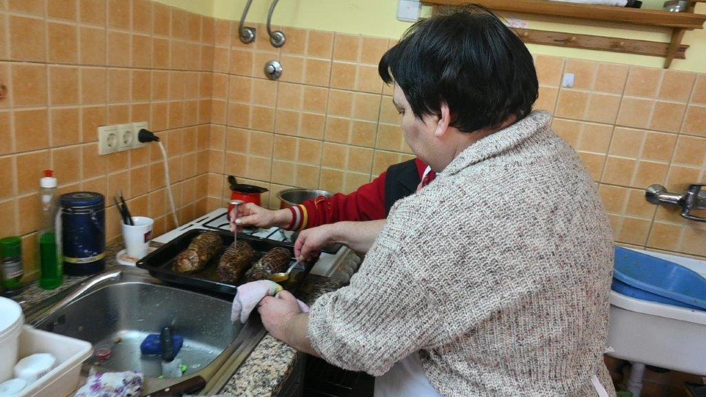Sicer pa, dokler se je meso popekalo, so članice in člani ter njihovi gostje so že poskušali pripravljene domače jedi: zeljno solato s fižolom, kuhane prekajene klobase in rebra, ter lansko popečeno meso. Seveda so prisotni, poleg ostalega poskusili tudi slovensko posebnost; Nekakšne kranjske klobase, ki jim v Prlekiji pravijo “prleške klobase”. Meso zanj solijo in ga popoprajo ter mu dodajo česnov sok. Nato ga stlačijo v brizgljo in ga vbrizgajo v črevo, kar ni lahko opravilo. Le malo prekajene se jedo kuhane, če pa se dimijo več kot šest tednov pa lahko tudi surove. Poznane so tudi v inozemstvu, saj so odlične. A tudi vse, kar so mesarji, kuharice in pomočniki tokratnih „prleških kolin“ pripravili, je bilo slastno in enkratno! Na razpolago pa so seveda bila tudi domača žganica in vina ter razne brezalkoholne pijače. Manjkalo pa ni niti sladkih dobrot, lepih besed in klepeta. Prizadevni predsednik TD Cven, ki šteje skoraj 40 članic in članov, ter bo prihodnje leto obeležilo srebrni jubilej, Janko Horvat, ki društvo vodi že 22 let, je spet žarel od zadovoljstva, da na njihovem „Grüntu“ vse poteka v najboljšem redu. In tako bo spet kmalu, ko bo občni zbor društva, do rezanja brajd in drugih nujnih opravili, pomladi bodo sadili koruzo ipd. Kot nam je pozneje povedala gospodinja Mira, so meso, ki se je popeklo v krušni peči in nato ohladilo, začeli polagati na zaseko v prleško tünko. V tünko so položili pet plasti zaseke in pet plasti pečenega mesa. Ko je bila tünka napolnjena do vrha so jo tesno zaprli in shranili v temen prostor v klet. Sedaj samo še počakajo, da bo preleška tünka „dozorela“ v leseni posodi…, katero bodo prvič odprli konec aprila, ko bodo dvigali mlaj.