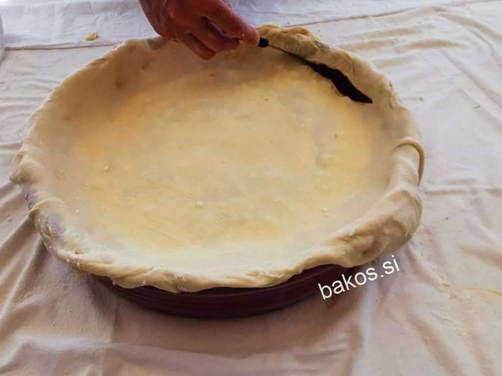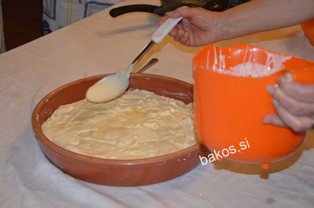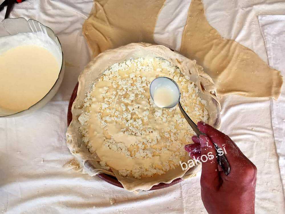 Vlečeno testo – sestavine: 50 dag pšenične moke, ena žlica rastlinskega olja,1 žlica jabolčnega kisa,1 jajce, ščepec soli, mlačna voda po potrebi. Skutni nadev – sestavine: 1 kg polnomastne skute, 3 žlice kristalnega sladkorja ščepec soli. Smetanov preliv – sestavine: do 1 liter kisle smetane, 3 jajca. Maščobni preliv – sestavine: 10 dag masla ali rastlinskega olja.