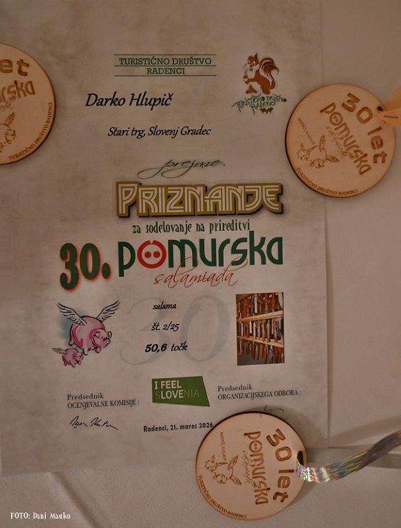 poudarjalo pomembno vlogo društva pri ohranjanju tradicije in bogatenju turistične ponudbe kraja. Pomurska salamijada tako ostaja pomemben družabni in kulinarični dogodek, ki združuje tradicijo, kakovost in skupnost, kot so poudarjali organizatorji. Ob robu samega dogajanja na jubilejni pomurski salamijadi smo izvedeli tudi nekaj zanimivosti. Tako je na vseh 30 pomurskih salamijadah je bilo ocenjeno skupaj 1.894 vzorcev salam, tekmovanja pa se je v vseh teh letih udeležilo 485 salamarjev. Vseh 30 pomurskih salamijad se je udeležil Edi Štanta iz Podgrada, ki se je letos uvrstil med prvake. V 30 letni zgodovini salamijade je bil prvak že 4 krat. Letošnji zmagovalec Viktor Zemljič se je uvrstil v finale že 12 krat, Milan Kolar 10 krat, Martin Tivadar in Maksmiljan Kvas pa 2 krat. Od letošnjih udeležencev so na pomurski salamijadi 20 in več krat poleg omenjenega Edija Štanta, sodelovali še Marjan Kralj, Viktor Zemljič, Franc Podlesek in Slavko Geder.